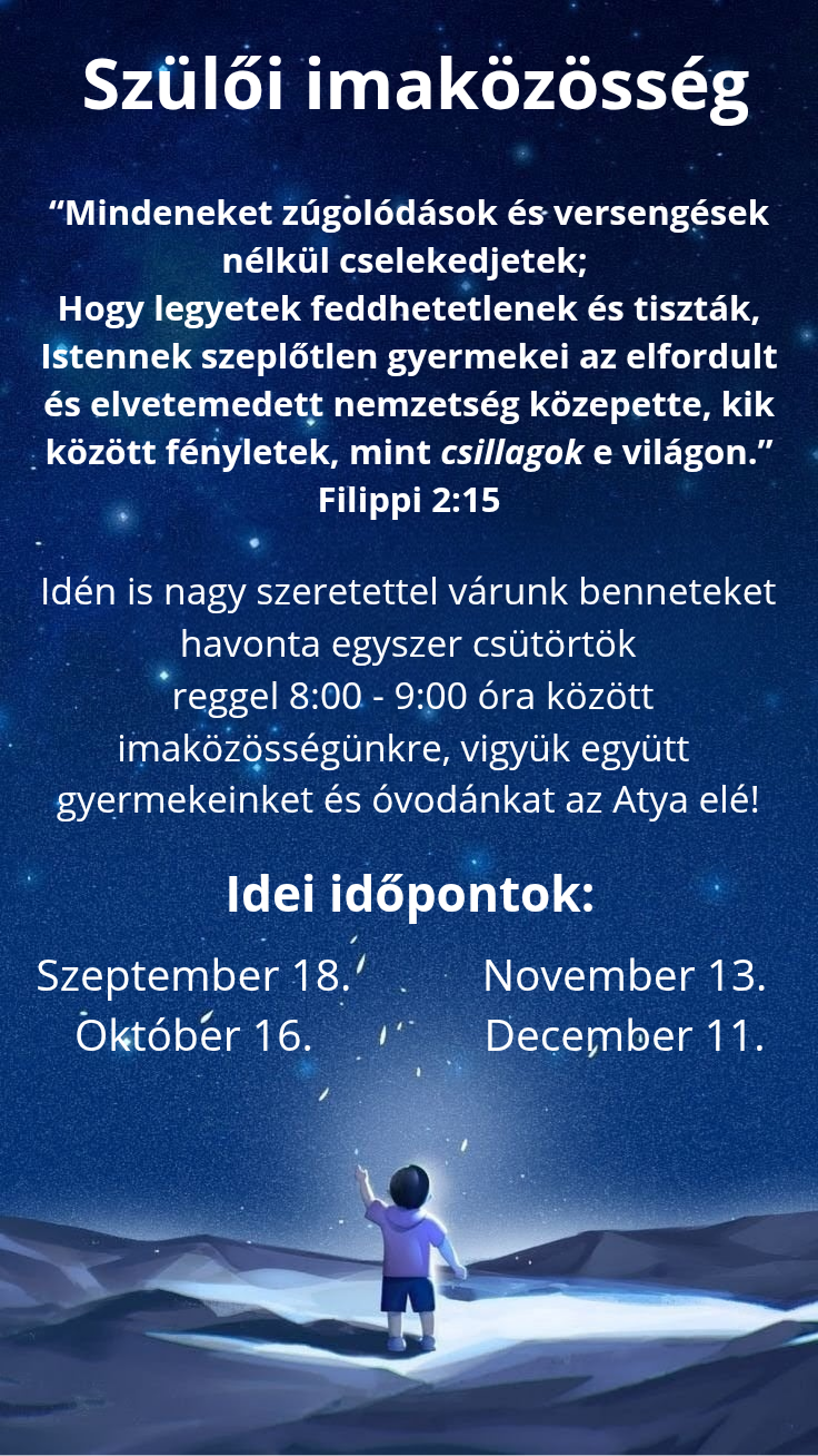 A szülői értekezletek egységesen 16:30-kor kezdődnek az óvoda tornatermében. Bárányka csoport – 2025. szeptember 10. szerda Hajnalcsillag csoport – 2025.